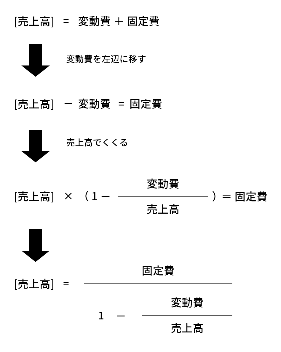 売上高=固定費÷(1-変動費/売上高)の式の導きかたはわかったのですが、元々求めたい左辺の売上高(損益分岐点)は未知数ですよね。
