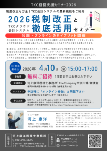 セミナー情報2026/02/13【セミナー情報】4月10日(金)TKC経営支援セミナー2026『税制改正とTKCクラウド会計システム徹底活用セミナー』を開催します。